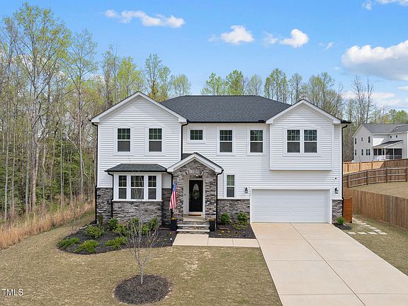 This better than new home shows like a model! Situated on a premium lot backing up to a super private, wooded, HOA owned common area. This exceptional floor plan offers 5 bedrooms, 3.5 bathrooms, an office or den, and a loft/flex space. The open kitchen/Great Room/dining areas make this plan flexible enough to fit any lifestyle. The kitchen features a large island and breakfast area with built in seating, designer appliances, quartz counter tops, ceramic tile backsplash, and a walk-in pantry. There is a first floor guest bedroom with an en-suite full bath. The primary suite and additional bedrooms are on the 2nd floor, along with the loft and laundry room. The primary suite is tucked away for privacy and has 2 walk-in closets, a walk-in shower with a glass enclosure, and a linen closet. To round it out, the 2-car garage, covered porch, and the fenced backyard offers something for everyone! The private back yard is the perfect retreat for outdoor activities and relaxation. Grill out with friends, or let children or pets play freely! Oak Park is ideally located - with everything you could need just 10 minutes away at White Oak Crossing Shopping center, 20 minutes to downtown Raleigh, and only 7 mins to the new I-540 exchange for easy access to RTP, the airport (28 min), Durham & more! This active community offers a playground, sidewalks throughout, and a nice, park-like outdoor gathering space where events like movie nights and food trucks are planned by the social committee! Contact the listing agent for details on the assumable mortgage at 3.625% Schedule your showing today
