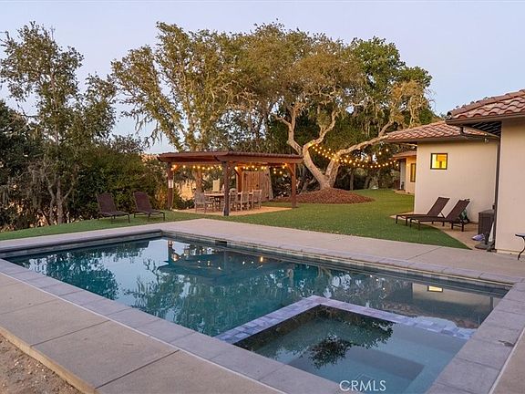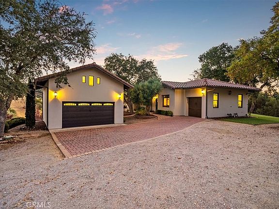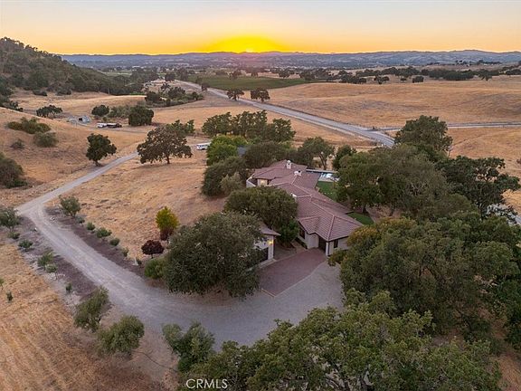 This stunning estate merges classic Spanish Hacienda style with modern luxuries, nestled on 5± acres of serene Templeton countryside. Featuring two custom homes and a detached garage shop, the property embodies sophisticated craftsmanship throughout. The main residence offers 3,055± sq. ft. of seamless living space, highlighted by stained and polished concrete floors, vaulted ceilings, and expansive French doors that invite you to the outdoor living areas. The entry welcomes you through a custom Alder front door, opening to a beautifully appointed living room, dining room, and kitchen—each featuring fireplaces, chandeliers, and custom windows. The kitchen impresses with a spacious limestone island, prep sink, walk-in pantry, and premium stainless-steel appliances. The primary suite is a retreat unto itself, complete with a cozy window seat, gas fireplace, expansive walk-in closet, soaking tub, and a custom travertine walk-in shower. Private patio access enhances the suite's luxurious ambiance. Complimenting the property, the 1,212± sq. ft. guest house boasts 3 bedrooms, 2 bathrooms, a charming front deck, and private driveway access. Both homes embrace indoor-outdoor living with hilltop views and shaded courtyard areas. Outside, enjoy a resort-like experience with a sparkling pool, hot tub, and spacious courtyard perfect for entertaining. Multiple seating areas, an artificial lawn, and shaded oak trees offer tranquility and relaxation. The property’s elevated position provides stunning hilltop views and breathtaking sunsets, creating an idyllic outdoor escape. The main home (111 Kim Ct.) currently operates as a short-term rental, while the guest house (109 Kim Ct.) serves as a long-term rental. This estate presents a rare opportunity for serene living or investment potential in beautiful Templeton.