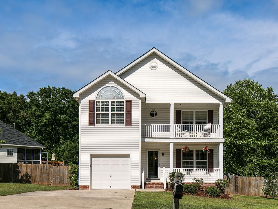 3D VIRTUAL TOUR.. Built in 2003. Charleston style home with a private covered balcony off master bedroom. Large den with hardwood floors and a gas log fireplace. Dining area with French doors to backyard. Eat-in kitchen with large pantry and access to attached garage. Half bathroom downstairs. Large master bedroom with vaulted ceiling, private bath with bucket tub / shower and walk-in closet. Laundry room on second next to all three bedrooms. Wide driveway accommodates multiple cars plus garage. Large backyard with wooden privacy fence and deck.