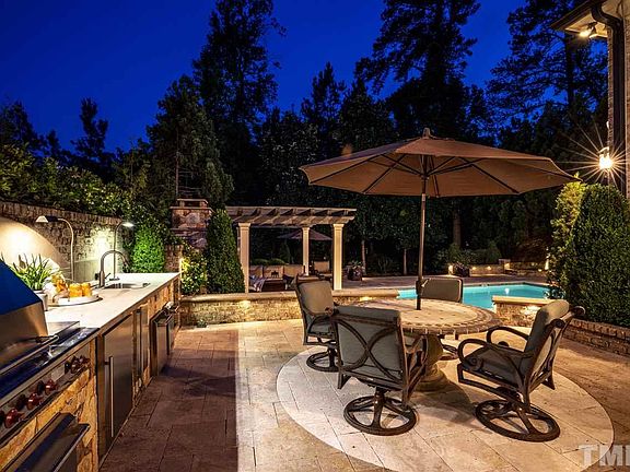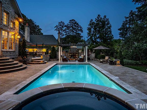 Welcome to this exquisite home close to the heart of Raleigh. A lushly landscaped private oasis awaits. The serene yard offers a heated salt-water pool with an all stone circular hot tub. Sit under the gazebo by the fireplace, while enjoying cooking at your outdoor kitchen or relax in the screened porch while watching TV. Enter into a beautiful custom home designed for entertaining. The gracious kitchen and airy family room showcase the architectural details which continue throughout the home.