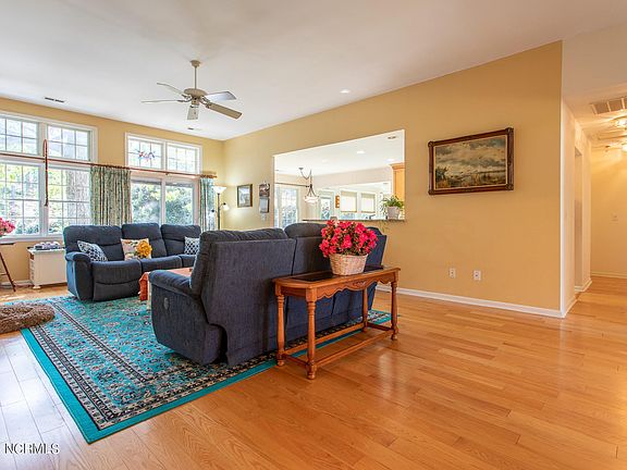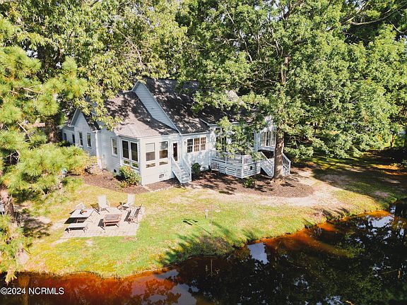 BACK ON THE MARKET Due to no fault by the seller. Beautiful, custom-built home in the gated golf and waterfront community of Albemarle Plantation. This low maintenance, one story home is move in ready. The property features an over-sized lot overlooking a pond, mature trees and landscaping beds ready for your personal touch. Home has a large great room with built in cabinetry and an infrared fireplace that is open to the modern kitchen, formal dining room, breakfast nook and sunroom. All with fabulous views of the spacious deck which is overlooking the pond. You will love relaxing in the sunroom with the view that allows you to enjoy all the North Carolina seasons and wildlife. The extended side yard with paved area for your firepit is perfect for entertaining. Large primary suite with sitting/office area. Two additional bedrooms and full bath allow family and guests a perfect area of their own. There is a large utility/laundry room with lots of additional storage and a convenient second refrigerator. The two-car oversized garage has yet more cabinets and attic storage. The exterior of the home was just painted. Roof and dual source heat pump/propane HVAC system were replaced in 2018. Now is the time to schedule a tour of this great property and to learn more about all that the Albemarle Plantation community has to offer!