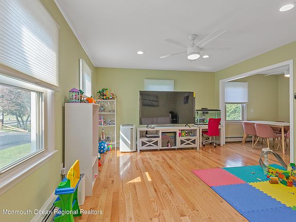 Move Right In! Sellers invested a small fortune refreshing this lovely home, on a unique location by downtown Freehold, yet conveniently by Rt.9. New Full Bathroom in Finished Basement! Recessed Lighting! All New Wood Flooring, Hot Water Baseboards, Stainless Fridge & Dishwasher, Ceiling Fans, Exterior Doors, Paint! Newer Septic. First Level features living & dining rms, kitchen, 2 beds, full bath. Upper Level used as large 3rd bed & additional room. Finished Basement w/full bath & two separate areas for play, study, entertainment, exercise, etc. Plus utility & laundry area. Private, enjoyable rear yard & patio. Detached garage w/ electric.