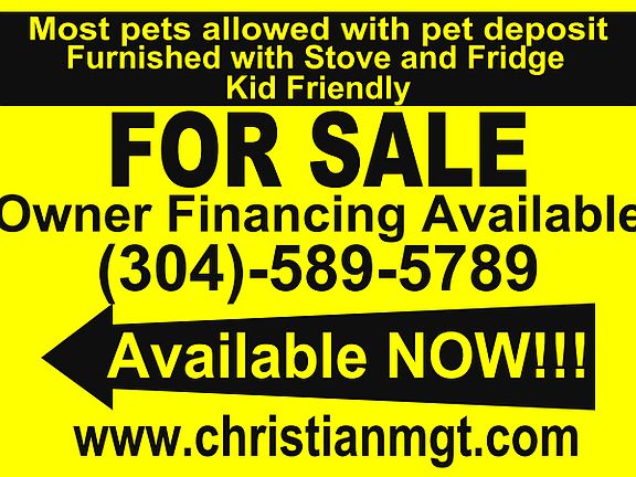 3 Bedroom 2 Bath older model mobile home available for Rent or Lease Option located just outside of city limits on Maranda Lane, off of Union Street Extension in Bluefield, WV, near Little Caesars on Bland Street. This mobile home is located in a very small and quiet mobile home park. Off street parking is available. RENT: Security Deposit: $395 (Security Deposit can be made in payments if needed) Monthly: $395 includes lot rent. No utilities included. LEASE OPTION: Initial Payment: $1,000 and no payments due for 30 days Monthly: $395 includes lot rent, property taxes, and insurance on the home. No utilities included. Pets: Most pets are welcome with a $200 pet deposit per pet and a signed pet agreement. No aggressive breeds. Limit 2 animals. Pet deposit may be made in payments if needed. Please Call (304)-589-5789. AVAILABLE IMMEDIATELY!! Same Day Approval! Clean, safe, quiet, crime & drug free is our goal. Good people with good, bad, low, or no credit but stable employment or Social Security welcome. Criminal Checks: -NO felonies -NO violent crimes -NO drug sales -NO sex offenders Call today to view: Christian Management at 304-589-5789 Is this home not what you're looking for? View my other available homes! Visit www.ChristianMgt.com Follow us on facebook for weekly specials at www.facebookcom/ChristianMgtCorp 3 Bedroom 2 Bath older model mobile home available for Rent or Lease Option located just outside of city limits on Maranda Lane, off of Union Street Extension in Bluefield, WV, near Little Caesars on Bland Street. This mobile home is located in a very small and quiet mobile home park. Off street parking is available. RENT: Security Deposit: $395 (Security Deposit can be made in payments if needed) Monthly: $395 includes lot rent. No utilities included. LEASE OPTION: Initial Payment: $1,000 and no payments due for 30 days Monthly: $395 includes lot rent, property taxes, and insurance on the home. No utilities included. Pets: Most pets are welcome with a $200 pet deposit per pet and a signed pet agreement. No aggressive breeds. Limit 2 animals. Pet deposit may be made in payments if needed. Please Call (304)-589-5789. AVAILABLE IMMEDIATELY!! Same Day Approval! Clean, safe, quiet, crime & drug free is our goal. Good people with good, bad, low, or no credit but stable employment or Social Security welcome. Criminal Checks: -NO felonies -NO violent crimes -NO drug sales -NO sex offenders Call today to view: Christian Management at 304-589-5789 Is this home not what you're looking for? View my other available homes! Visit www.ChristianMgt.com Follow us on facebook for weekly specials at www.facebookcom/ChristianMgtCorp