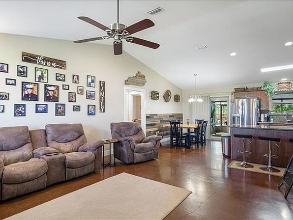 Beautiful Craftsman style home in Marsh Bridges. The first thing you notice is the gorgeous landscaping and manicured yard. Inside has a split floorplan, vaulted and trayed ceilings, stained concrete floors, granite countertops in kitchen and both bathrooms, stainless kitchen appliances, and lots of custom decorator touches throughout. Relax outside at the end of the day on the spacious screened porch, or on the covered lanai overlooking the refreshing saltwater pool! Storage shed in the fenced backyard as well as a covered 10x12 pad, great for parking a small recreational vehicle or boat. Don't miss the neighborhood access to a stocked fishing pond. Additional features- pool has multi color/function LED lights, upgraded vinyl liner, robot cleaner and pump on timers, includes all pool equipment and 3 chaise lounge chairs, and raised garden beds in backyard.