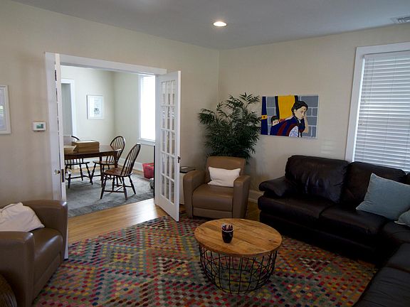 Off street parkingSunroom with built-in shelvesDining roomBeautiful hardwood floors