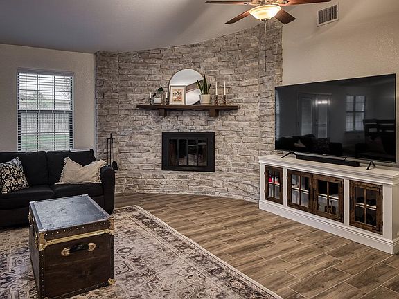 Welcome to this beautifully updated home located in Buena Vista Neighborhood. Upon entering, you're greeted with a spacious open-concept layout with new wood-like tile, gorgeous wood beam along the cathedral ceiling, and cozy stone fireplace. The newly installed wet bar features quartz countertops and beautiful cabinetry to match the updated bright and cheerful kitchen with a double oven, large sink, and stainless steel refrigerator. Unwind in the relaxing primary bedroom and bathroom featuring a glass shower, dual vanity, and modern lighting. There's plenty of room for entertaining in the spacious backyard with oversized covered patio. Location is key--right down the street to Buena Vista Park w/playground and pool, Lion's park w/running trail, and the new sports complex, "Field of Dreams". New a/c and hot water heater installed 2020.