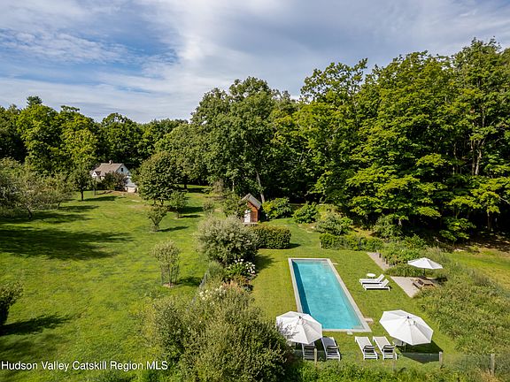 Outdoors, the property unfolds like a storybook. A heated gunite pool with its own heated pool house and outdoor shower is surrounded by flowering gardens and newly planted apple and cherry trees. A half basketball court, vegetable garden, and hidden paths winding past century-old oaks and a stream that traces the edge of the property offer endless opportunities for recreation and exploration. Recent upgrades include a new roof on two guest houses, extensive landscaping, and refinished interiors, which have brought thoughtful comfort to this historic setting. Located on a quiet country road just 15 minutes from Hudson and Amtrak, Kanso Cottage Estate offers the best of both worlds: total privacy and the ability to immerse yourself in Hudson's dining, art, and cultural scene. Currently a successful short-term rental, the property offers new owners the flexibility to continue its income-producing potential, enjoy it as a private compound, or both.