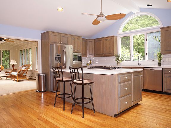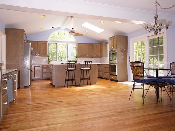 An exceptional value! Located in sought after Southern Ridgefield, minutes to town and NY border. An ideal home for entertaining with serene and tranquil ambiance. Boasting an abundant 3400+ sqft of gracious living space (above grade), 4 Bedrooms, 2 Full and 1 Half Bath, large Kitchen (chefs delight) with an abundance of counter space and cabinetry, massive center island with seating, dining area, wet bar, vaulted ceiling, skylights and access to deck. Formal dining room with fireplace, fabulous four-season sunroom with skylights, living room, family room with stunning built-ins and second fireplace. Beautiful hardwoods and french doors throughout. Master bedroom suite complete with dressing area, full bath, his/her closets and organizers. Three additional generous sized bedrooms and full bath (dual vanity, linen closet, whirlpool tub) upstairs. The basement offers a large finished space perfect for a home office and play/rec room (not included in sqft). Huge main level laundry room with washer and dryer. Spacious 2 bay attached garage. Oversized deck with Trex decking and new Azek composite railings. Propane grill hookup. Generator/Transfer Switch. Beautifully sited on level 3 wooded acres with babbling brook, mature trees, specimen plantings and lush lawn. Located in Colonial Heights, an established neighborhood and the best commuting location. Approx 59 miles to NYC. Easy down county/NY commute and just minutes to town and all Ridgefield has to offer.