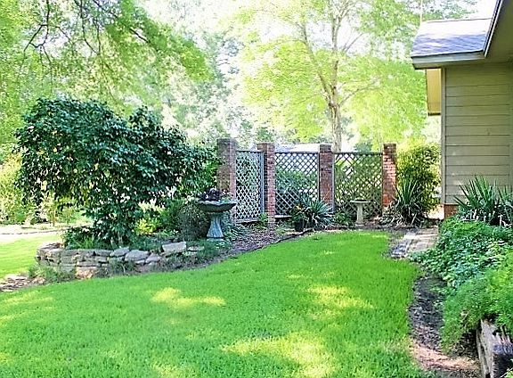 Relax on your secluded patio swings overlooking this beautifully landscaped 1.4 acre lawn, brick paved walkways line lush manicured grounds, charming pergola, window lined living room provides abundant natural light and a panoramic view, wood burning fireplace, formal dining room and combined breakfast area provides additional space for entertaining, walk-in closet, storage, over-sized utility room and pantry, workshop includes a half bath. Enjoy the nearby golf course, lake, state park, walking trails, dining, stores, schools and club pool. Seller is providing a one year home warranty protection plan! Contact an agent today to preview everything this home has to offer!