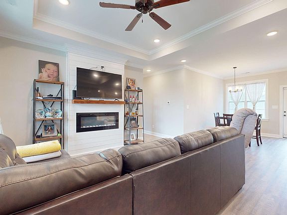 Stunning newer construction home situated on a corner lot in the desirable River Birch subdivision off of Market Street Ext. This beautifully designed residence features three generously sized bedrooms and two elegant full baths. The immediate eye catcher of this home is the modern fireplace that is recessed into a shiplap wall that extends all the way up to the tray ceiling in the open-concept living room. Adorned with a floating mantel-this will be talked about as soon as any guests enter your home! There is sleek LVP flooring through-out the main areas, while the bedrooms are carpeted for added comfort. The kitchen boasts a polished granite island and countertops, complemented by premium stainless steel appliances. The home also includes a double-car garage with a fully paved driveway, offering both convenience and ample parking.