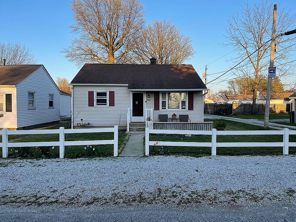 This 2 bedroom, 1 bath home on a corner lot offers the following updates... new flooring in hallway & living room in 2021, ceramic tiled shower, new privacy fence in 2020 with fully fenced backyard, updated landscaping 2020, new driveway stone 2020, new garage door 2019, new water heater 2020, new refrigerator 2020, and crown molding. Natural hardwood in bedrooms. Open front porch and back patio for your summer night enjoyment. The property also features a 1 car garage with attached workshop - currently used for storage. All appliances stay!