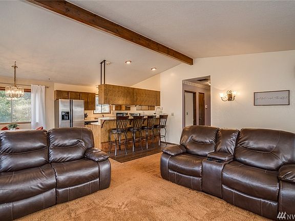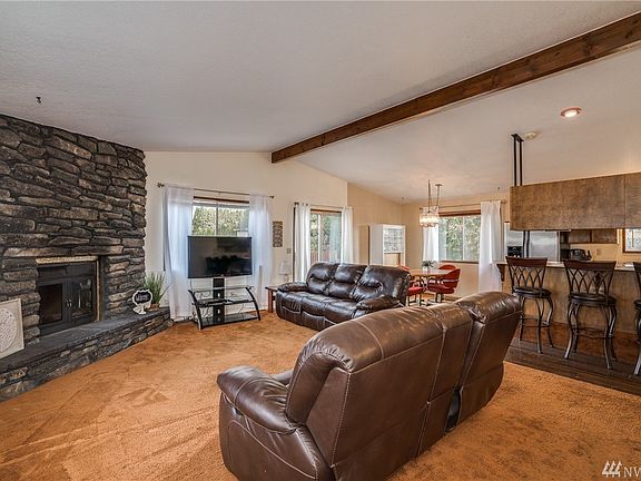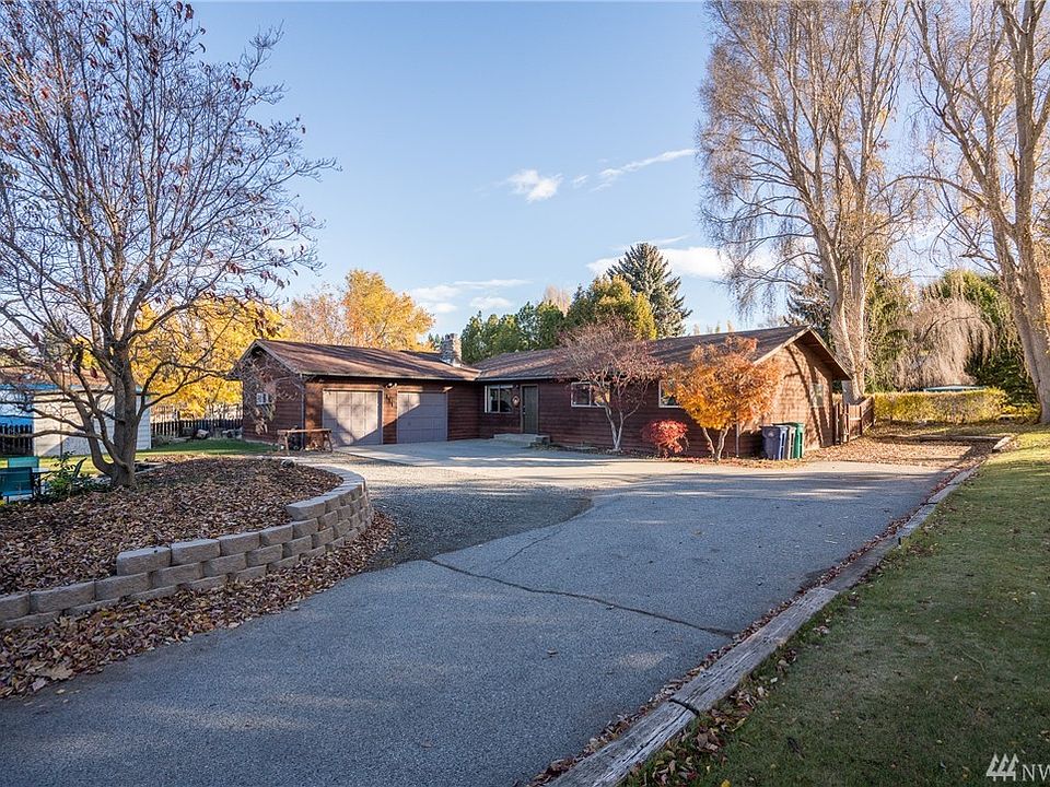 One level living located on a private drive surrounded by mature landscaping and extra parking. Enjoy the cozy fall weather in the living room with the crackling sounds of the wood burning fireplace. The spacious eating bar overlooks the kitchen with stainless steel appliances. New furnace and heat pump. One garage bay has been turned into a family room with epoxy flooring offering lots of extra space. A fenced backyard, firewood storage area, a shed for garden tools and RV parking.