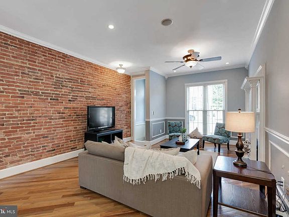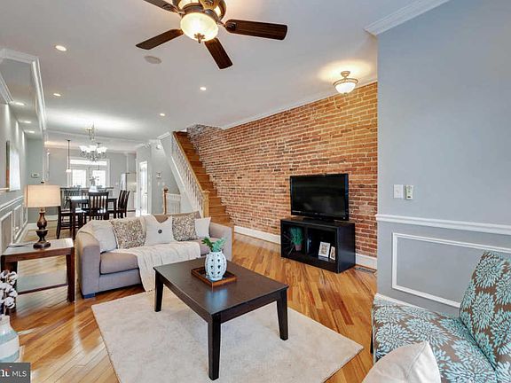 Just a block off Patterson Park, this renovated townhome is a must see! Lots of attention to details here including diagonally laid, rich hardwood floors, picture box molding, chair rails and crown molding throughout open floor plan. Kitchen features white cabinets, granite countertops, stainless steel appliances with glass-paneled french doors leading to spacious composite deck. Skylight fills the heart of the home with natural light and provides a sleek look against the exposed brick. Generously sized bedrooms with a flex space in the middle would serve nicely as a home office, game area or reading area. Fully finished basement with good ceiling height makes for an excellent entertainment space or potential for 3rd bedroom.