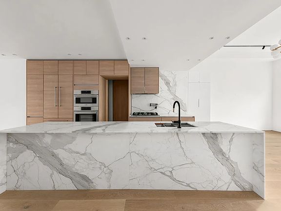 Stepping out of the elevator, you'll discover a dreamy, open chef's kitchen featuring Calacatta Borghini marble backsplash and countertops. The kitchen boasts top-of-the-line appliances, including a 30" Double Wall Bosch Oven, 36" Bosch gas cooktop with sleek black stainless-steel knobs, a MasterCool French Door Miele Refrigerator, Bosch dishwasher, and a Summit wine fridge. All of these elements are seamlessly integrated into the elegant wood paneling, including a cleverly concealed walk-in pantry.