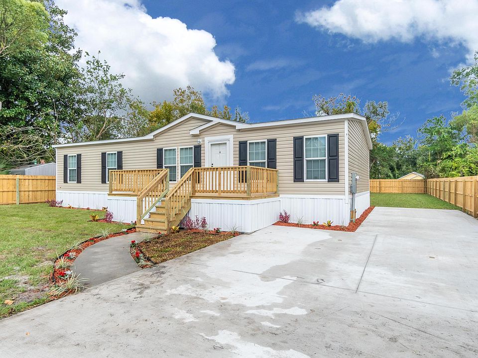 Why wait to build? Brand new mobile home with split floorplan featuring modern touches and farmhouse style. Large kitchen with solid surface food prep island opens to family room to make your home the holiday entertainment location. Owner's Suite with en-suite bathroom features walk-in closet, garden tub and custom tile shower with rainfall faucet. Custom built desk on front and back of the home to enjoy your morning coffee or beverage of choice in the evening. Entire yard is fenced to allow privacy for the kids to play all day. New septic tank and drain field. Extended driveway and full irrigation system. Conveniently located close to River City Marketplace and interstate system for easy access to beaches, downtown and airport.