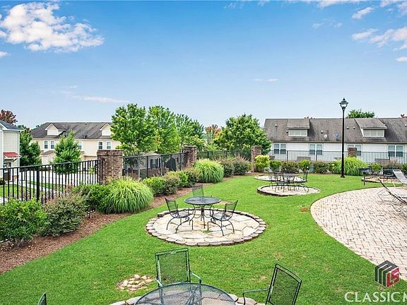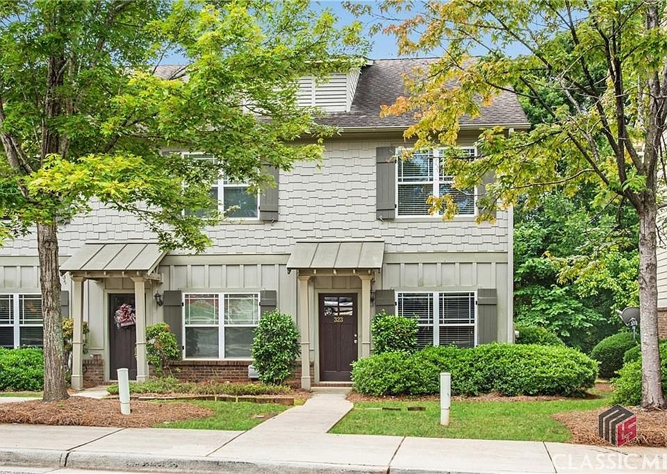 Fresh paint, new laminate on main and new carpet upstairs! 9' smooth ceilings on main. Open concept plan - living room open to dining area w/chair railing. Half bath on main. Kitchen includes built-in microwave and refrigerator + walk-in pantry. Washer/dryer included. Roommate style floor plan features two vaulted bedroom suites both with private bathrooms. Rear patio w/storage room. Parking pad behind unit. Also plenty of on street parking in front. Bring your investors - NO RENTAL restrictions. Swimming pool community. HOA covers lawn maintenance, exterior maintenance and trash service. Just 10 mins to UGA campus.