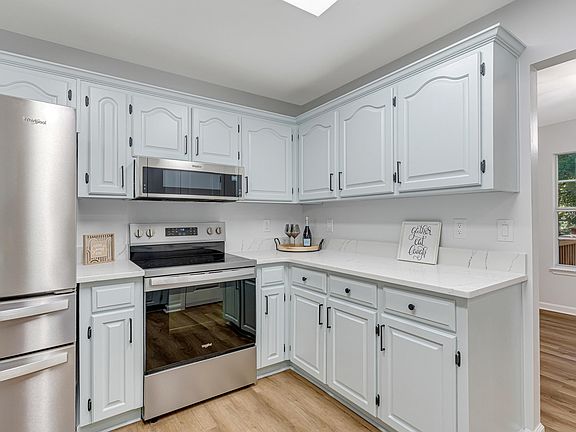 This beautifully updated home features new LVP floors throughout, carpeted bedrooms, and fresh coastal paint. The stunning window design floods the home with natural light. The kitchen features new quartz countertops, new stainless steel appliances, and a separate pantry. The master suite offers an extra seating area--perfect for a nursery, office, or reading nook--along with a double vanity, separate soaker tub, stand-up shower, and walk-in closet in master bathroom. Enjoy a separate bedroom floor plan, a 2-car garage, and a rebuilt deck overlooking a serene, wooded backyard with mature trees. Additional updates include 2020 HVAC, 2006 metal roof (permitted), and 2025 water heater. Located on a quiet one-entrance/exit street, this home is well-lit, inviting, and easy to show.