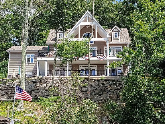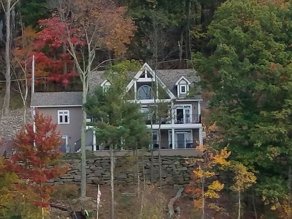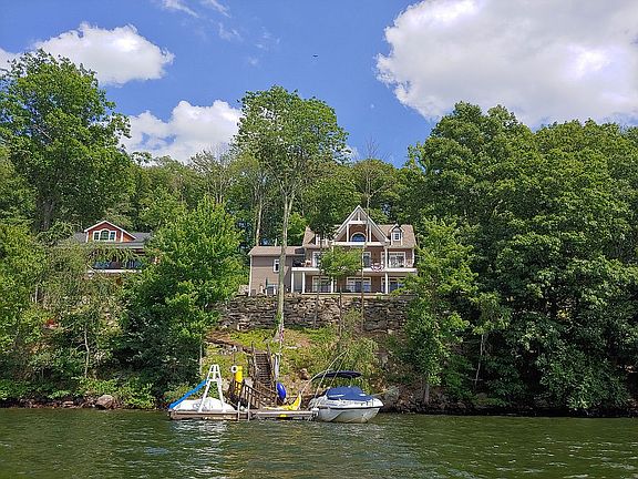 Direct Waterfront home with beautiful lake views and western exposure. Enjoy beautiful sunsets in this 4 BR 3 bath home. Full 40 foot lakefront deck to enjoy meals and lounge as you watch the boats go by and entertain guests. Large covered patio downstairs to enable cover from the sun or rain. Main bedroom with ensuite on main level separated from the other three bedrooms that are on another floor with their own living area and bath. There is a private main boat dock as well as 2 jet ski docks. Large wood workshop facing the lake with walkout. Owned underground propane tank serves this energy efficient home with propane heat, cooking, fireplace, hot water, grill, firepit and dryer. Also a whole house generator is included.