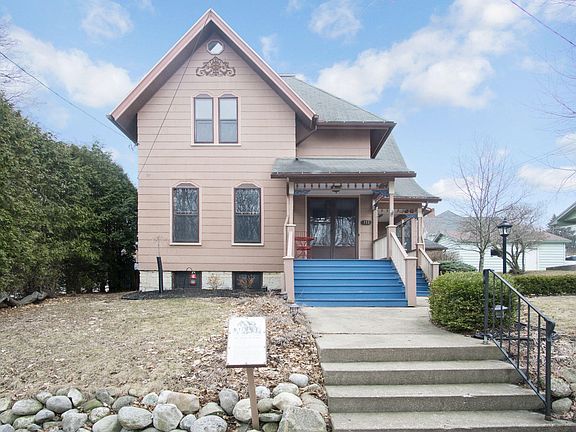Lovely Historic Victorian home w/5 bedrooms and 2.5 baths offers plenty of room for your lifestyle. Many ornate, original features, starting in the foyer with the etched glass monogramed front doors, classic curved banister/stairway cozy seating area and easy flow to the spacious living room, parlor & dining room. Delight in the original hand carved trim/woodwork with hardwood floors, soaring ceilings and windows with original shutters, Fireplace in parlor and cozy window seat. Many updates since 2005 that include baths, Kitchen, with cherry cabinets, maple floors & Quartz Counters w/stainless appliances. Master bedroom w/bath has Quartz counters and Italian-Carrera Marble with claw foot tub and separate shower. Upstairs w/3 large bedrooms, family room, full bath. Finished 3rd floor loft is great for play room, office or additional bedroom. Full basement & 1 car detached garage with low maintenance yard.