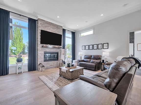 In the prestigious neighborhood of Pinnacle Ridge discover this gorgeous BUNGALOW w/ a TRIPLE ATTACHED GARAGE. The entrance welcomes guests w/ soaring ceiling height, an abundance of windows & views into the OPEN DESIGN. The living room is perfectly planned for large scale entertaining & has a gas f/p. The kitchen has white full height cabinetry, a huge island in a darker/warmer toned finish, s/s appliances, gas stove, quartz counters & tile backsplash. The dining nook has direct access to the covered back deck w/ a built-in outdoor gas f/p. The main floor primary suite has a walk in closet, access to the covered deck & a luxurious 5pce ensuite w/ custom shower, double sinks, floating tub & throne room. An office, 2pce bath & laundry room/mudroom complete the main floor. The 2nd level has 2 large bedrooms & a 4pce bath. The FULLY FINISHED basement has a huge rec room w/ wet bar, sit up island bar, media area, workout room, 2 large bedrooms w/ walk in closets & a 4pce bath.