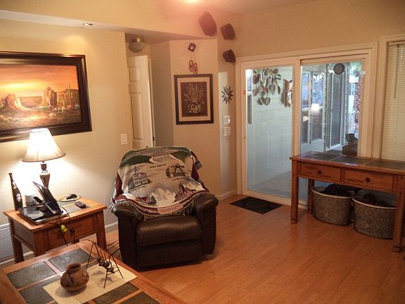 2010 Cavco with Arizona room built by Lonnie Buettner. Hardy Board siding, full cement pad, laminate flooring, large custom-tiled shower, and front entry workshop. Bricked side yard for parking bicycles or golf cart. Double-paned windows and very modern side by side refrigerator and washer/dryer. East facing for morning sun and afternoon shade on the large tiled deck. Quiet location with 48th Street gate access. In pet sections. Special cat-friendly features. Couldn't be replaced for this price. Included in sale: W/D, refrigerator, range, dishwasher, TV on wall in park model, and platform storage bed sans mattress. Other furnishings are negotiable. Land is included with the mobile home.