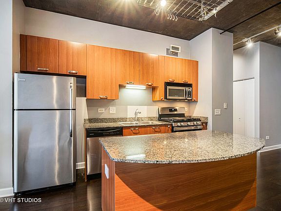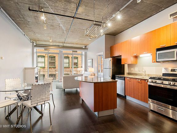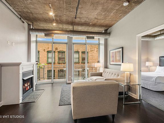 Finally a 1 bedroom in the West Loop with table space AND a separate area to make a home office/zoom space! Be hip and cool in the best of the neighborhoods while having the room to work comfortably from home. Walk in to this east-facing home and you will find walnut-stained flooring and a front area that is perfect for the home office set up (with plenty of space for a large desk area or even small tv sitting area). The kitchen includes a center island, hanging pot rack, and brand new stainless steel oven, and offers an area for a dining table. The living room includes a gas fireplaces and opens out to a balcony that spans the width of the entire home for exceptional outdoor space. With this ideal floorplan, there is a fully enclosed bedroom with windows. (It's amazing how difficult that is to find in this neighborhood.) Walking through a hall with two organized closets, you enter the bathroom that can be used as a primary bathroom and ingeniously closed off to make a powder room for the living space at the same time. The bathroom includes a double-bowl vanity, brand new subway tile tub surround, and new tile flooring. Additionally, you have in-unit washer and dryer and good in-unit storage. One garage parking space is included in the price. Of course outside the home is where things get even better. Imagine living right in the heart of the West Loop and being able to walk to any imaginable restaurant you could want. Hang out in the Fulton District or Greek Town with your friends. Take a lunch break outside in the Mary Bartelme Park 1 block over. Walk to the Loop. And on a more practical matter, Target, Marianos, & Whole Foods are an easy stroll away, as is both the Green Line El or Blue Line El. What more could you possibly want?