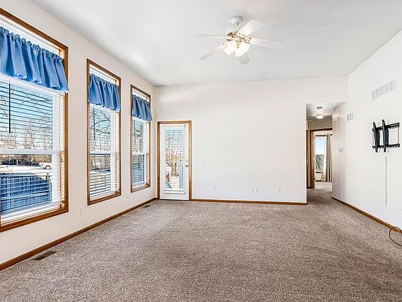 Welcome to this charming half-duplex ranch that offers a perfect blend of comfort, style, and practicality. Step into the bright and airy family room, featuring soaring high ceilings and an abundance of windows with transoms, allowing natural light to flood the space. A door leads to the deck, providing stunning views of the expansive backyard and serene tree-lined lot. New blinds throughout the home add a fresh touch to every room. The spacious kitchen is a cook's delight with an impressive amount of cabinetry, a breakfast bar area, and easy-to-maintain laminate flooring. Adjacent to the kitchen is the inviting breakfast nook, complete with a chandelier for a touch of elegance. The main-level laundry room offers added convenience for daily living. Retreat to the spacious primary bedroom, which features large windows and a ceiling fan. The primary bath is equipped with his-and-hers vanities, a separate commode room, and an easy-to-clean shower. Plus, the large walk-in closet with built-ins provides plenty of storage. The walkout lower level is a standout feature of this home. A door leads to a large patio, perfect for relaxing and soaking in the tranquil views of nature as the seasons change. The generously sized finished area offers additional living space, while the unfinished portion provides plenty of room for storage and organization. Enjoy the convenience and ease of ranch-style living in this thoughtfully designed home—everything you need is here!