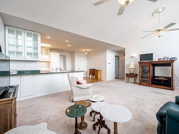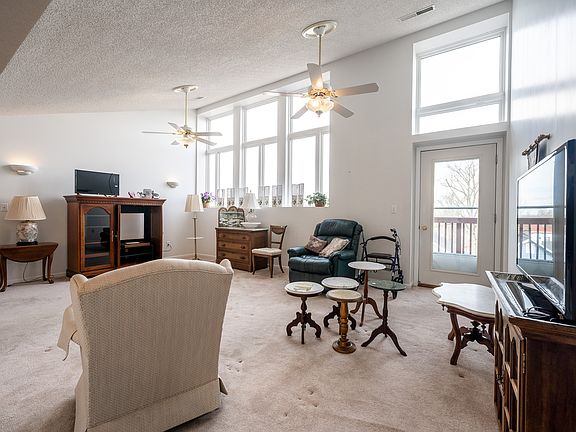 Downtown Greencastle condo with amazing views of rooftops and countryside to the north. This condo is within walking distance to DePauw University, the library, post office, butcher shop, restaurants and downtown shops. You will enjoy the convenience and quiet living in this 55+ community. This 2 bedroom unit features soaring cathedral ceilings, lots of natural light, balcony, dining area, formal living room, kitchen with breakfast bar & lots of cabinet space, & 2 full bathrooms. Laundry room in the primary suite. Both bedrooms have large closets & there is an attic space for additional storage. Comes with a parking space in the attached parking garage. Building has shared community room & grounds with mature trees. All appliances included.