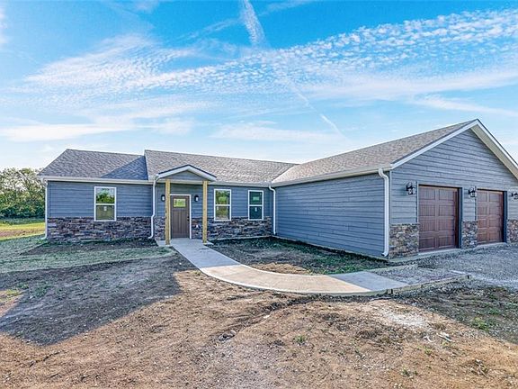 Welcome to your dream ranch home nestled on a picturesque 3+ acre lot within the serene Maple Lake Estates subdivision, discreetly located just off DD Hwy. Over 2150 sq. ft. all on one level. Gorgeous views plus private access to Hickory Hills Lake. The 7' wide Entry brings you to the open 24'x19.6' Great Room. The heart of the home, the Kitchen, showcases elegant granite countertops, custom cabinets and stainless steel appliances. The spacious 18'x16' Master Bedroom offers a peaceful retreat and connects to a luxurious en-suite bathroom. Here, you'll discover a double vanity, a beautifully tiled shower, a private toilet room, and an expansive walk-in closet thoughtfully designed with ample shelving to accommodate your wardrobe. Working from home has never been more inviting with a private office that features two sets of elegant French doors, providing a quiet and productive space. Step outside to the back patio, where you can savor evening shade and take in the serene surroundings. The oversized 720 sq. ft. two-car garage ensures plenty of room for your larger vehicles or additional storage needs. Exterior is high quality LP Smart siding. Just 5 minutes from Warrensburg, 8 minutes from Whiteman AFB, 40 minutes from Sedalia or KCMO; this home offers the perfect blend of rural living and convenience.