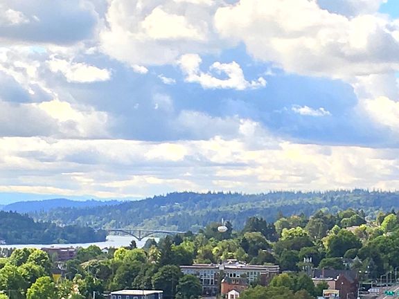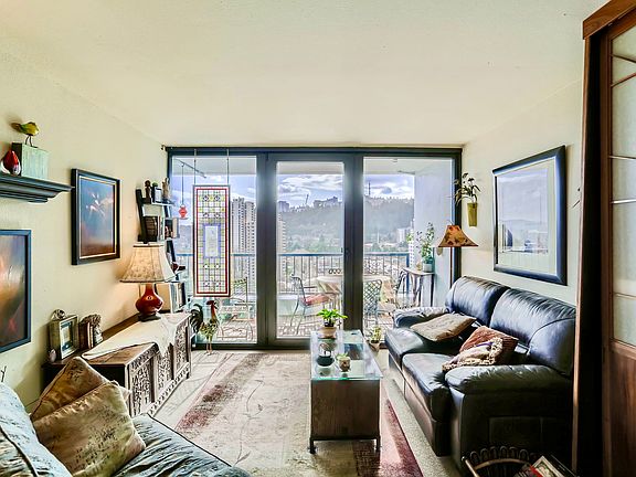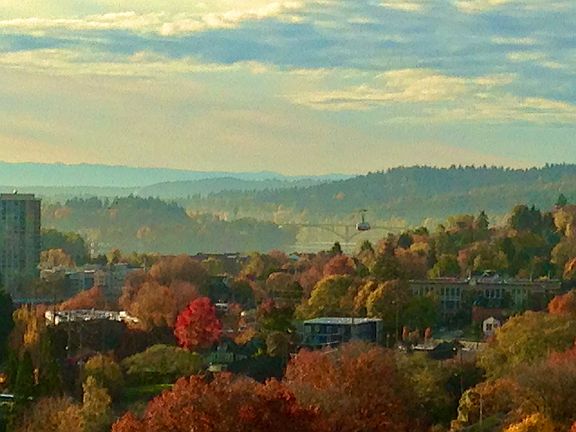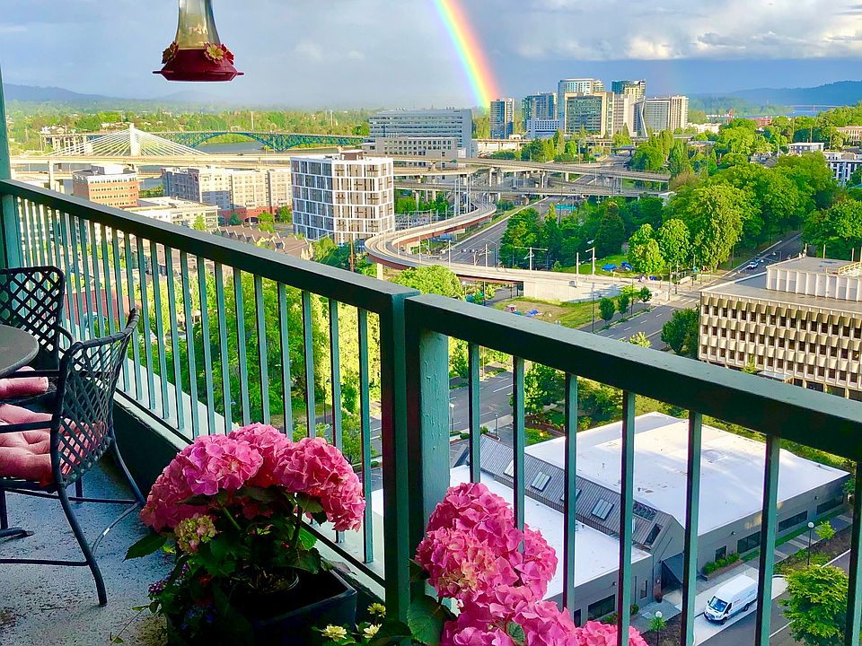 SPECTACULAR VIEW, IN A GREAT LOCATION. Just down the hill from Portland State, walking distance to the waterfront and adjacent to Portland's Arts District, with a panoramic views of the river beaches and bridges as well as downtown, this is a true one bedroom with a Queen bed, a fully equipped kitchen and breakfast bar (doubles as a desk) which opens into a charming living room with a new Smart TV. Easy access to OHSU by tram and buses/trolleys (right next to the building) to everywhere else. With its south-facing double balcony and window walls you can enjoy this spectacular east to west vista in all seasons and all weather. An indoor parking place is included, as well as a basement storage unit, three closets, and lots of storage space in the condo itself. The location offers walking opportunities on both sides of the river as well as local parks. On foot you can be downtown or on a forested hillside in fifteen minutes. It even has its own park plus fountain behind the building and Portland's most beautiful fountain (Ira Keller Fountain, across from Keller Auditorium) one block away. This is a pet-friendly building (especially dogs) and well-behaved pets are welcome. There is a large shared laundry room in the basement which is a great place to meet people if you're so inclined. Otherwise privacy is respected and community is there to enjoy but optional.