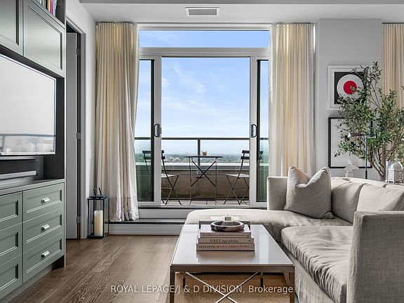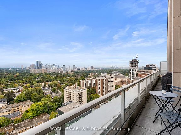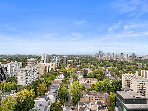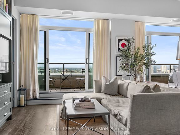 Rising above the city on the 19th floor, this residence is more than a home-it's a statement. A full-width balcony with gas line spans the suite, with four walkouts that open to forever views over Forest Hill. Dramatic 11-foot ceilings and walls of floor-to-ceiling glass flood the space with natural light, creating a seamless connection between the interior and skyline beyond. Inside, thoughtful design meets uncompromising luxury. The custom Cameo kitchen-appointed with Wolf and Sub-Zero appliances-anchors the home as both a showpiece and a chef's delight. A floor-to-ceiling custom stone biofuel fireplace adds warmth and quiet sophistication to the expansive living and dining area, setting the tone for evenings spent in style. With 1,471 sq. ft., the layout balances flexibility and flow with the ideal two bedroom split plan plus a versatile den or office with stunning custom millwork, three spa-inspired baths inclusive of a powder room, and a full laundry room. The balcony offers a gas line for a BBQ, blurring the line between indoor and outdoor living. This rare offering includes private elevator access (exclusive to the 19th floor and above) and direct elevator access to your parking and locker room. (Ask about additional parking). Enjoy exclusive access to a private gym reserved solely for residents for the 19th floor and above + unlimited access to the 20,000 square foot Imperial Club complete with golf simulator, indoor pool, gym, party room, media room, sound studio, theatre room ++. Enhanced pet policy allows pets up to 40 kg (88lbs) for residences on the 19th floor and above. Longos, LCBO and Starbucks on the ground level! Streetcar at your front door! This is a lifestyle defined by elegance, comfort, and meticulous attention to detail.