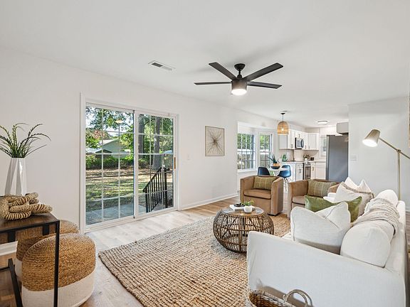 Welcome home to this charming and beautifully renovated brick ranch on a picturesque 1/3-acre lot in the established neighborhood of St James Estates with no HOA! The thoughtful renovation includes all new wood laminate flooring, stylish fixtures, well-designed bathrooms, and so much more. The flexible floor plan offers spacious gathering areas, as well as 3 bedrooms, plus a FROG (finished room over garage) that would be perfect for an office, playroom, or 4th bedroom. As you enter the foyer from the welcoming front porch, you're invited into the large dining room with a gorgeous original picture window. The kitchen, with its freshly painted white cabinets, new stainless appliances, and quartz countertops is open to the casual dining space, with a classic original bay window,and the cozy family room. You'll love to retreat to the Primary bedroom and your stunning new bathroom with double vanity, recessed lighting, brushed gold fixtures and mirrors, and the fully tiled walk-in shower. Two more bedrooms share a hall bathroom that has been completely renovated using a classic black and white palette that includes a new vanity with quartz top and a soaking tub with subway tile surround. The large, fenced backyard with shade trees, patio, and firepit is perfect for relaxing and entertaining, and the lovely front yard features a peach tree, lime tree, and fig tree. Other highlights include smooth ceilings, fresh paint inside and out, a new water heater, new front and back doors, a 1 car garage with service door and so much more. St James Estates is conveniently located near Tanner Plantation, so just minutes to Bowen's Corner Elementary, grocery stores, restaurants, shopping, and parks. You'll be within 20 minutes of the airport, military bases, beaches, and historic Charleston. This is the perfect home for someone who wants to leave the weekend house projects behind to enjoy all that Charleston has to offer. Owner holds a SC real estate license (inactive) and agent is related to owner.