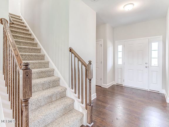 The beautiful Clayton home plan, Elevation F, now under construction at Oyster Landing in Sneads Ferry! This two story home plan boast over 2500 heated square feet with four bedrooms and a home office. The primary suite is located on the first floor and comes complete with tray ceiling with crown molding, a large soaking tub and separate shower, dual vanities, private water closet and spacious walk in closet. Enjoy an open kitchen to living area with fireplace. The kitchen includes a large kitchen island, pantry and bright white kitchen cabinets and is just off the formal dining room. Other features include a mudroom, central staircase and large loft area and second floor laundry room. NOTE: Floor plan renderings and photos are similar and solely representational. Measurements, elevations, and design features, among other things may vary in the final construction. Call to verify.
