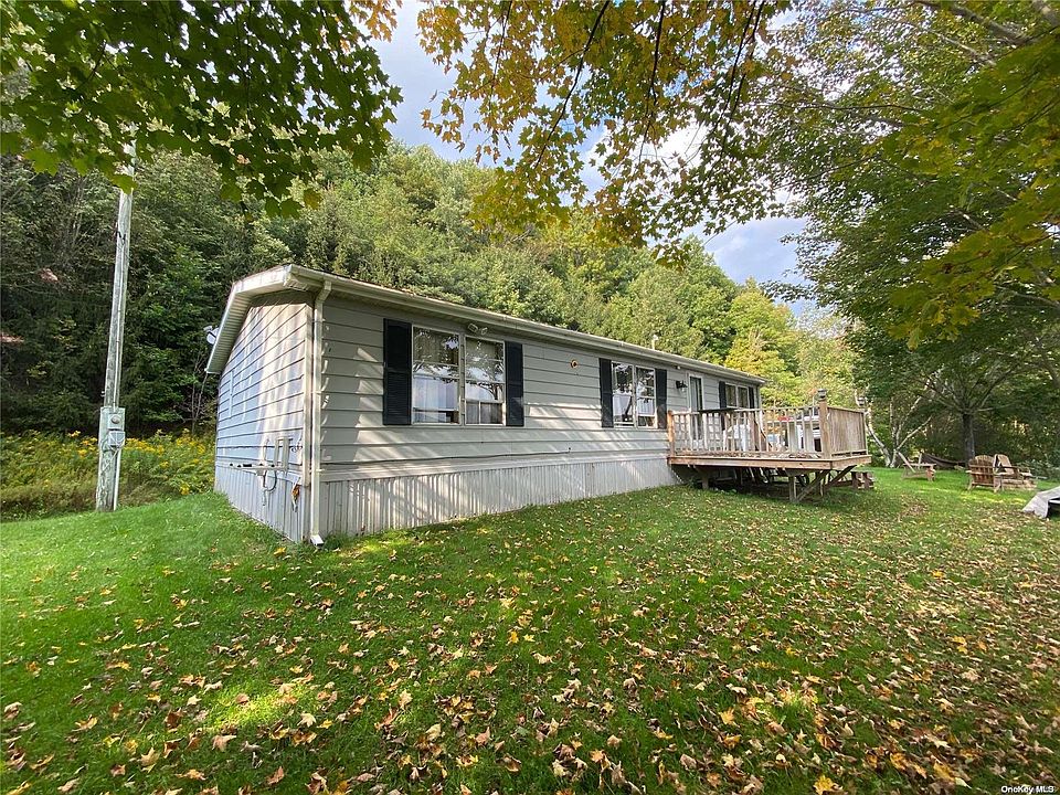 Welcome to this 3 bedroom, 2 bathroom 1,150sf manufactured home (Skyline 1988) on 29 acres in the town of Kortright. Located at the end of a private road (ROW) the home is situated a cleared area lined with pine trees with wooded acrage behind. Interior has open floor plan with living room, dining area, pellet stove, kitchen, breakfast bar, pantry/laundry room (hookup), primary bedroom with private full bathroom, 2 bedrooms and a hallway bath. Spectacular year-round views from the deck. Electric baseboard heat + pellet stove. 12 minutes to supermarkets, shops, restaurants in Delhi or Stamford. Short drive to Oneonta, Cooperstown and Windham, Hunter, Belleayre, Plattekill Ski Mountains. Taxes are county/town/fire + school.