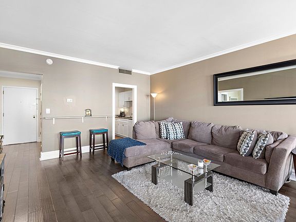 Inside, the bright and airy layout features stunning new hardwood floors throughout, an open living area, and French doors that lead to a spacious bedroom with a walk-in closet and in-unit laundry.