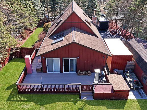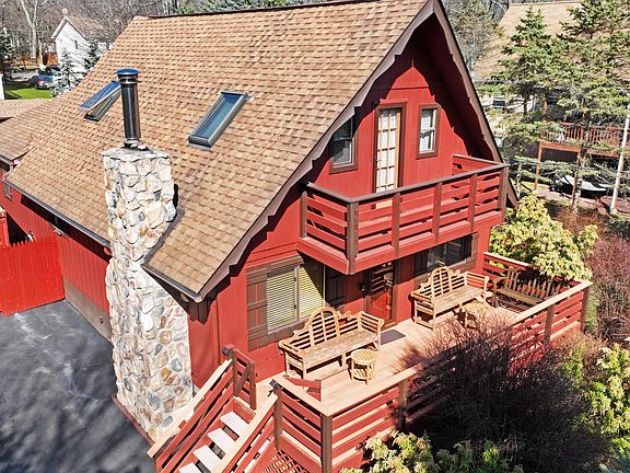 CUSTOM BUILT CHALET WITH TOP-TIER CARPENTRY THROUGH OUT, A SPA LIKE RETREAT WITH SAUNA, STUNNING STONE FACED WOOD BURNING FIREPLACE, AND AN OUTDOOR OASIS IN BOTH THE FRONT AND REAR OF PROPERTY! Look no further for your escape to the Pocono Mountains, with this extraordinary 3 bedroom luxurious cabin featuring Mahogany floors and knotty pine ceilings and walls throughout! The moment you pull down the lovely long driveway and step foot on the property you know you'll never want to leave. A front porch looks overs your private, flat front yard where outdoor surround sound speakers welcome your guests for a weekend in paradise. Inside a huge living room gives off an alluring vibe with the crackling fireplace, and warm wood tones of the exposed beams and wood accents! Easily divide half this space into a formal dining room if need be! Guests arrive at the kitchen island to enjoy a culinary display by the chef who has ample work and storage space to put out a meal to remember! After dinner - open all of the glass slider doors and bring your party to your indoor jacuzzi, sauna, and ''lounge'' -- a soon to be favorite for all of your friends and family! Rinse off in your spa like first floor bathroom equipped with a steam shower! A little corn hole outback in your fenced in private backyard with the smells of barbecue also makes for a nice gathering! A main floor beautiful bedroom with wood ceilings and walls is perfect for guests not interested in climbing the stairs. Upstairs two more elegant escapes; bedrooms designed as luxurious cabin retreats with skylights, wooden accents everywhere, and one with a private balcony as well! CENTRAL A/C! Immaculate crawl space! Two sheds including a 30x12! Newer instant hot water heater! Propane connected to the outdoor grill. Seller owns the propane tank! Memory lights in the bedroom remember last setting! THE LISTING AGENT IS OFFERING A FREE 1 YEAR HOME WARRANTY WITH THIS HOUSE! Schedule your private showing today