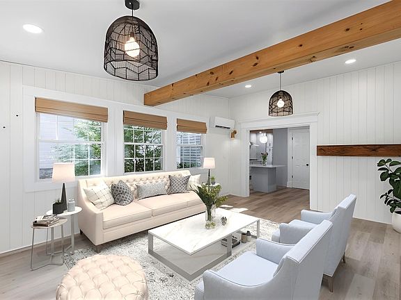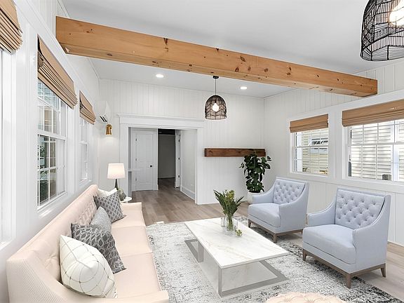 Step into a storybook setting as you turn down a quiet shaded street in the heart of the budding West End and approach this gabled, cape-style home completely renovated by its current occupants. The front door, flanked with window boxes, opens to a chic, modern kitchen with quartz countertops, herringbone backsplash and all new cabinetry, flooring and appliances while retaining its vintage, planked knotty pine ceiling. First floor spaces include an intimate dining room and a bright, sun-filled living room featuring cathedral ceilings, exposed beams and access to a coveted, level, fenced backyard - perfect for organic gardening, swimming pool, hot tub or entertaining. Returning inside, the second level includes 3 bedrooms and a windowed nook, which, along with a finished attic, provides work-from-home office space or additional storage. Rise and shine to a floor plan that also boasts two upscale, fully renovated surprisingly large bathrooms with handsome, custom finish. A detached carriage house supports 4 cars in tandem, workshop, ample storage or explore the potential to renovate to guest quarters if desired. Truly a walk-friendly location just around the corner from Pine Park where summertime fun awaits and a brief jaunt to bustling downtown Portsmouth to grab a quick cup of coffee, restaurant options and easy highway access. This home offers the additional benefit of immediate occupancy.
