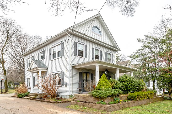 Center Hall 3 Story Colonial Home in a prime location on the Eastside of town. Filled with the charm and character you expect to find in this heartwarming top rated town. Enjoy a relaxing afternoon or evening on the covered front porch and feel a part of the Community. Covered front entry leads to a center hall with glass French Doors to Formal Living Room with brick wood burning f/p and custom built-in bookshelves, cabinets and window seat & custom window treatments. 2 sets of double doors to the side porch. Glass French Doors off the foyer to the generous size Formal Dining Room. Beautiful hardwood floors with mahogany inlay and 10 ft. 1st floor ceilings. Kitchen features lots of Hickory solid wood cabinets with lots of light brought in from the 4 side windows over the sink and lots of recessed lighting. Powder room off the back hall and stairs leading to the finished family room in the basement with built-in wet bar and recessed lighting. Beautiful Wood staircase leading to 2nd floor hallway. Master Suite with private bath, large soaking tub and shower stall, vanity and triple wood medicine cabinet with vanity light. 2 generous his/her closets. 2 Additional bedrooms and recently remodeled full bath with ceramic tile tub surround and floor, wainscoting, vanity with granite top. Exposed oak hardwood floors on entire 2nd floor. 3rd floor features a very large 4th bedroom with plenty of room for sitting area, great lighting and views, double closet and a walk-in finished storage room that could be used as a private office with a large atrium window overlooking the Avenue. Extra-large rear yard with basketball court and storage shed. Looking for the large family-style home?.this is it!