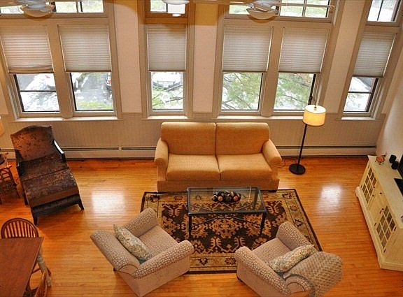Ultimate style of living with very low maintenance. This larger size unit has 1400 square feet of living space. Loft style master bedroom, dressing room with large closet (Could be turned into master bath!). South East exposure with wall of windows. Dramatic open main level floor plan with 13 foot ceilings second bedroom and office. Excellent condition, hardwood floors. Great location within walking distance to Cornell University