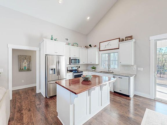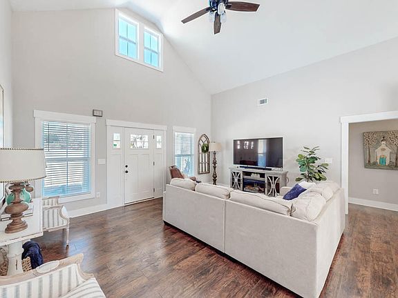 Welcome to this beautiful 3-bedroom, 2-bathroom home that perfectly blends modern charm and comfort, all on one level! Featuring a delightful rocking chair front porch, this residence invites you to sit back and enjoy the surroundings! Step inside to an open floor plan highlighted by vaulted ceilings in the main living areas and beautiful custom trim throughout! The gorgeous wood flooring adds a warm touch, making this space perfect for both relaxing and entertaining! The bright and inviting kitchen is a chef's dream, showcasing granite countertops, a stylish tiled backsplash, and an island with a butcher block surface! A convenient barn door leads to the pantry, and modern appliances including a range, built-in microwave, and dishwasher make meal prep a breeze! The adjoining dining room offers a lovely spot for family meals! The spacious owner's suite features a tray ceiling and a generous walk-in closet, while the ensuite bathroom boasts a stylish double sink vanity with a framed mirror and a sleek shower! Two additional roomy spare bedrooms are perfect for guests or family, with one showcasing an adorable board-and-batten accent wall! The guest bathroom is equally charming, featuring a great vanity! The laundry room provides ample space to add a freezer, adding extra convenience to your daily routine! Step outside to the covered patio overlooking a fenced backyard, which extends beyond the fence line, offering plenty of space for outdoor fun and relaxation! An extra parking pad ensures easy access and turnaround! This beautifully modern home is move-in ready and waiting for you to make it your own! Don't miss out on this fantastic opportunity! Great location with easy access to downtown Augusta, downtown Aiken, SRS, Bridgestone, Fort Eisenhower and so much more!