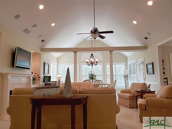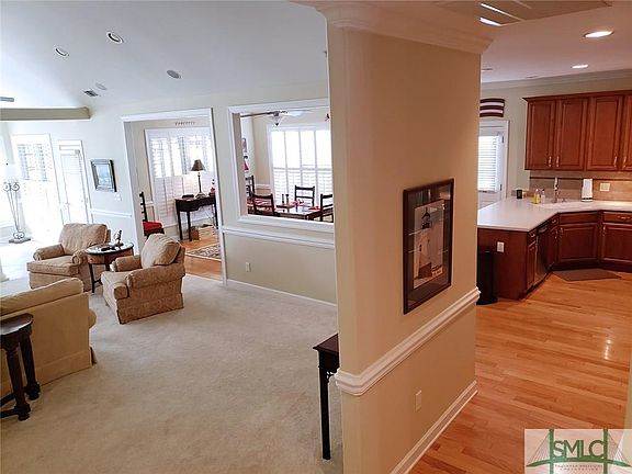 Don't miss out of this move-in ready townhome with awesome views of the 2nd fairway of the golf course. Beautiful hardwood flooring, crown moldings, & plantation shutters throughout. Custom kitchen with breakfast bar, and beautiful cabinetry, & open to the great room & dining room. Spacious master on main with tub, separate shower, and dbl. vanities. 2nd bedroom/study on mail, sunroom/formal dining room, with awesome light and golf views. Great room with fireplace flanked with bookcases, screened porch on rear & open patio. 2-car garage with space for golf cart. Upstairs features 2 additional bedrooms and bath. Generous walk-in attic for storage. S/S refrigerator, washer/dryer remain. Walk to Publix & restaurants in the Savannah Quarters Village. Convenient to shopping & dining along the Pooler Parkway, 15 minutes to downtown Savannah. Don't miss out on this beautiful maintenance-free townhome!