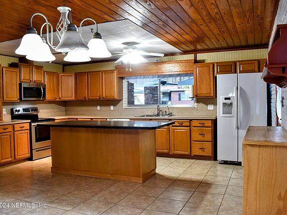 Experience peaceful living in this beautiful & spacious home with vinyl siding, brick accent & NEW METAL ROOF (July 2024) on a private road in East Palatka w/ no HOA! This treasure features a large livingroom with built-in cabinets & storage, 12' x 20' Florida Room with vaulted wood ceilings, brick accent wall & fireplace that opens onto a wood deck and beautiful shaded fenced back yard! The open kitchen was designed for convenience with an abundance of cabinets, center island, eat-in diining area & patio off the kitchen for grilling & enjoying the birds! The 3 bedroom, 2 bath home has a large master bedroom (12' x 25') with double closets & private bath. The attached doulble carport is 24' x 22'. Enjoy wood working is the detached 264 sq' L-shaped workshop with electric! Total Under Roof Sq Footage is 3,052. Measurements are estimated. New boundary survey on file. MUST SEE!