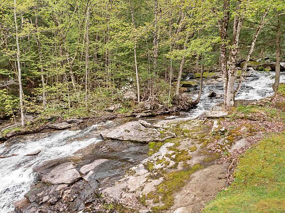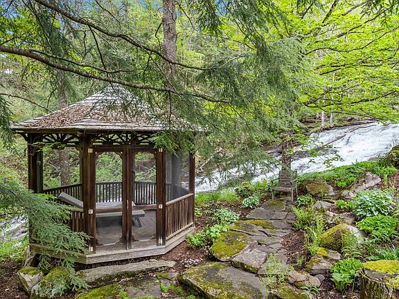 The stunningly beautiful and dynamic waterfall is visible from most rooms in this home (and audible from every room!) -- imagine falling to sleep to the sound of the cascading waters. The house is gorgeous and very spacious. A wonderful place for big gatherings of family and friends or the perfect place to have in home offices. Huge windows to take in the falls and gardens, gleaming hardwood floors, Juliet Balcony, a big deck and a circular stone patio all add to the appeal. When the snow is coming down and the frigid stream is rushing down the ice rimmed falls, the one-of-a- kind rose quartz hearth and chimney with wood stove will keep you toasty. The current owners have made a lovely 0.8 acre trail that follows the brook through the woods where there are smaller falls and lots of swimming holes. A new stone wall by the driveway and beautiful perennial flowers abound. The flat lawn is also perfect for croquet, badminton or volleyball. There is also a perfect area for veggie gardening with a shed and fenced raised beds. The cherry on top is the newly screened and rebuilt gazebo which perches just on the edge of the falls! Open House May 25, 11 am to 1 pm.