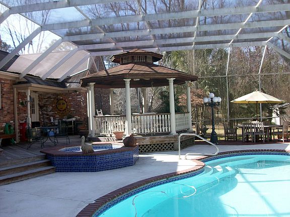 Beautiful brick home located outside the city limits. 4 Bedrooms, 3 Bath; Hardwood Floors downstairs; Spacious Kitchen with Tile Counter Tops. Attractive landscaping. Enclosed pool area with an In-ground Hot Tub, Gazebo; Pool House.Small Pond located in the rear. Property is enclosed with attractive black Iron Fence. 1 room Guest House.