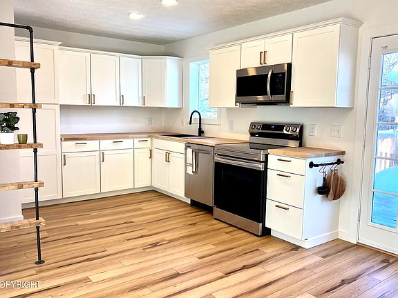 Beautifully updated downtown Palmer home- excellent location close to schools & shopping. Complete interior renovation in 2023 to include luxury vinyl plank floors, new kitchen cabinets, SS appliances, butcher block countertops, tiled shower & new bathroom vanity. Vinyl windows, new doors, updated electrical & heating systems in 2005. Fully fenced yard & back deck to enjoy the the Alaska summers.Seller will make health and safety or 'subject to' repairs, if any are found on appraisal. As built available for review.