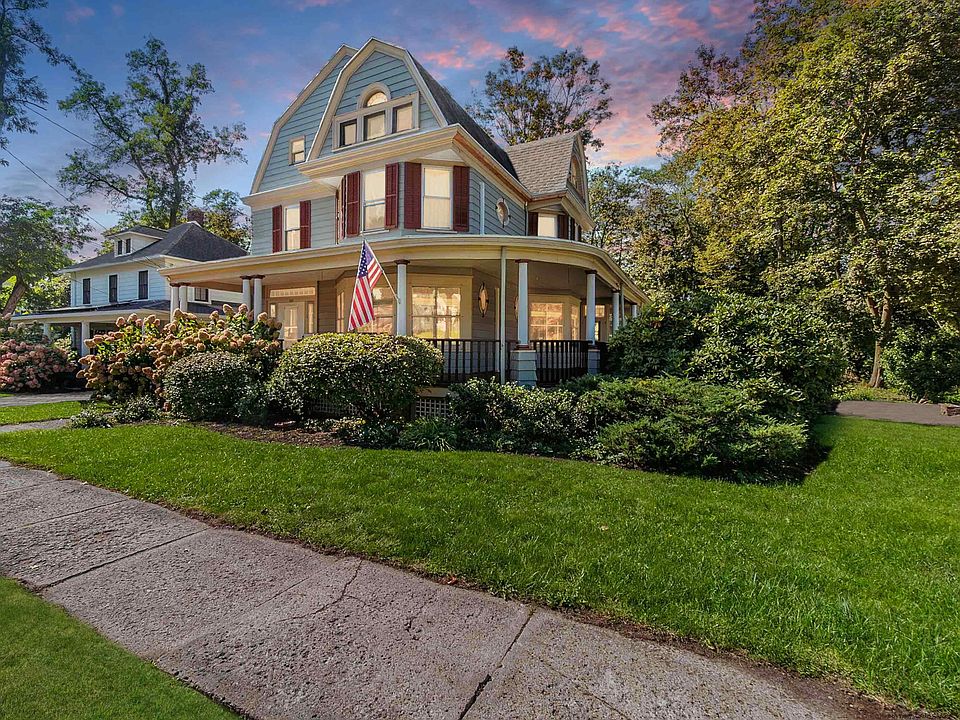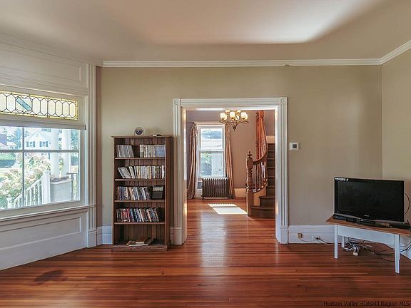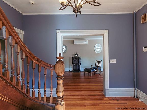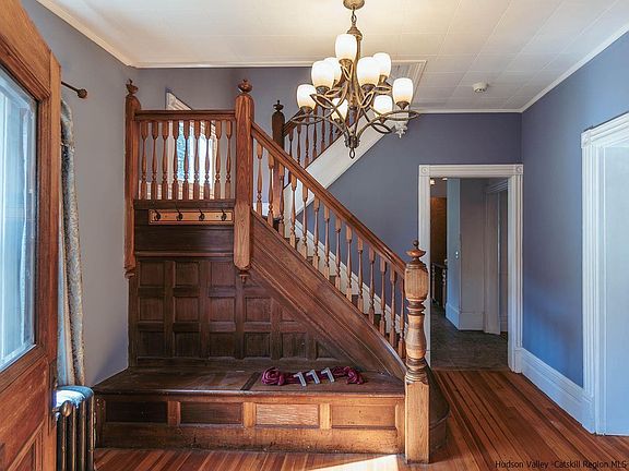This classic Kingston Victorian home was designed and built by the original owner, Earnest Becket, a freemason who poured his heart into its thoughtful design and unique features. A prominent gambrel roof is the distinguishing characteristic of this Dutch colonial revival home – a style that swept through the United States during the first half of the 20th century. This exceptional home is ideal for year-round entertaining and retains many original features including antique American stained-glass windows with shield designs and original storms. A chestnut wood paneled staircase with stately columns and beaded fretwork spandrels greets you after entering through a grand front door. Well cared original heart pine amber floors are throughout the living, dining and the 2nd floor bedrooms. A window framed dining room includes built-ins with a kitchen pass-through. The original wavy glass solarium includes a woodstove, full bathroom, and sliding glass doors. This sun filled room is surrounded by lovely perennial garden views and has great potential to be built out as a guest suite since it also has its own entrance. The updated kitchen is spacious with great room for cooking. It is perfect for hosting potlucks and the holiday parties that will become an annual tradition. A gas stove and double Bosch split convection oven get the job done. This home is perfect for outdoor entertaining with its elevated BBQ deck, tiered garden and perennial landscaping. Officially, the home has four bedrooms, two full and one 1/2 bath. An extra four rooms on the third floor could make for a large bedroom, home office, studio space or additional guest bedrooms. Very rare, the 3rd floor includes original tin ceilings and walls - plus an atrium. The partially finished, large basement has high ceilings, full-size windows, exposed brick, and bluestone. This has excellent potential as extra living/studio space, access apartment or rental expansion. Enjoy watching the pileated woodpeckers, hummingbirds and monarchs visiting the butterfly garden. Bordering the Chestnut Street Historic District, this home is located in a residential area of the city of Kingston, a community on the west side of the Hudson River, midway between New York City and Albany. Just down the hill toward the water for the historic Rondout District shops, Kingston Point Park, or Kingston Point Beach. Cross to catch the Kingston Greenline and arrive in Uptown Kingston in mere minutes. The park-like historic Montrepose Cemetery is at the end of the block - and is great for dogs to or just enjoy its beauty throughout the seasons. This home is move-in ready, with plenty of flexibility to make updates over time.