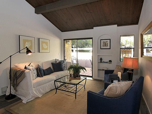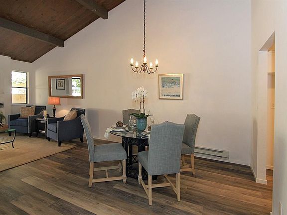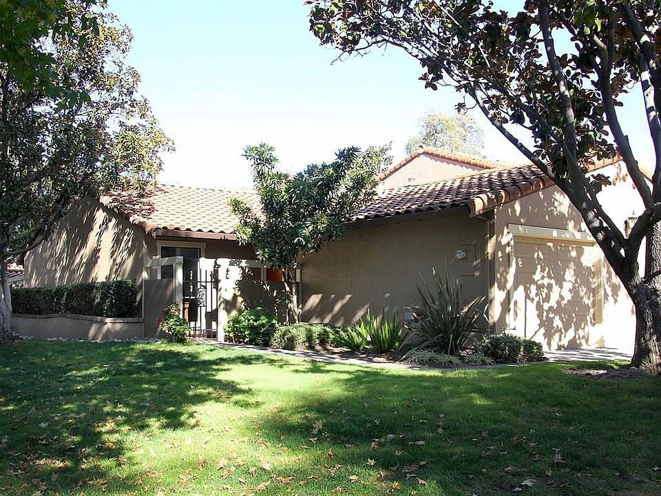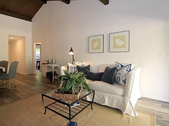 Beautifully remodeled single level condo is a desirable end-unit within walking distance to downtown Campbell. Dramatic vaulted open beam ceilings, remodeled kitchen with granite counters and new stainless appliances, remodeled bath, granite top vanity with decorator finishes, hardwood-style luxury vinyl-tile flooring throughout, indoor laundry room and all freshly painted with a 1 car attached garage. Entertain on the private gated patio, steps to community pool.