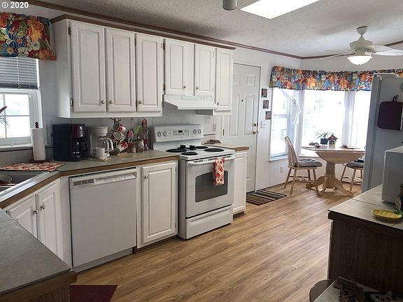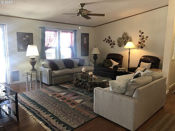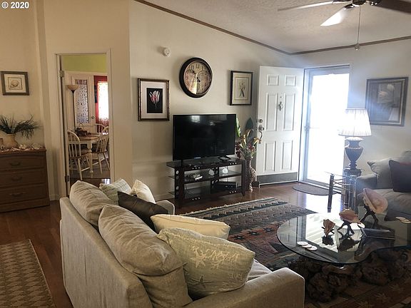 Immaculate home. New heat pump and furnace, new flooring in kitchen and bathrooms. The price includes all furnishings (most of which were purchased in the last year), window coverings and new light fixtures. Master bedroom is currently being used as office/family room. Covered porch with fenced patio. This is located in a 55+ very well maintained park. Easy to show.
