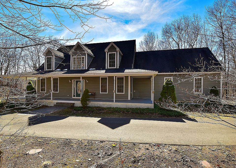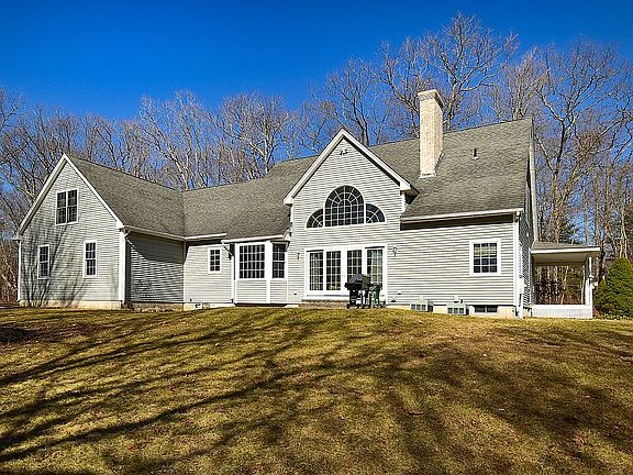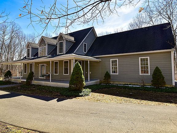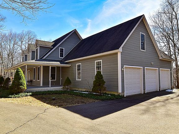 Stunning very private 4 bedroom contemporary Cape with rap around porch on a 10.33 acre property with waterfront to a 16 acre pond. House also has spacious vaulted ceilings in foyer and family room, first floor master bedroom with whirlpool tub and shower also first floor laundry,1/2 bath and bedroom-office. Upstairs is balcony hallway ,full bath and 2 large bedrooms, one has very large closet. And to round it out a very good size bonus room over a three car garage with a separate staircase,.And for all you car guys and gals out the the three car garage had a 4 post car lift large 80 gallon compressor and is heated