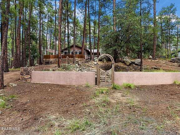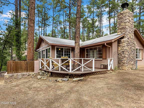 Welcome to Camp Run-A-Muck cabin in the woods! Built out of block construction with a majestic custom stone fireplace and tranquil views from every room.Only 10 minutes from downtown Prescott and 5 minutes to Goldwater Lake!Ample parking among the Ponderosa Pines on an elevated lot giving you fantastic views and privacy.This unique property sits on over a half acre allowing space for a future guest home or you could subdivide and sell the other lot.Updated flooring includes hardwood in the main living areas and Berber carpet in the bedrooms. Custom tile work in the bathroom and with a wall mounted towel heater.This home would make an excellent vacation rental with all paved road access; high speed internet and water association.Gently used home for 19 years.